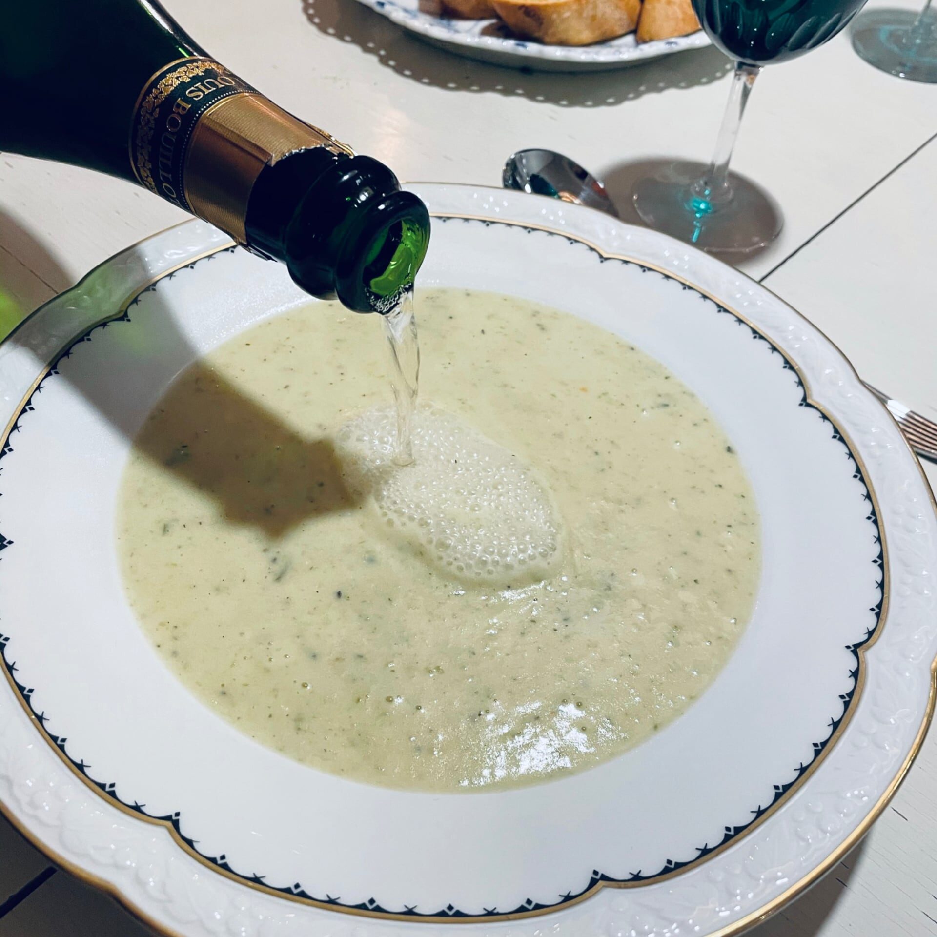 Denna enkla soppa lyxar man till genom att addera champagne vid servering. Häll upp soppan i de finaste skålar du har, häll på champagnen vis servering, cirka ett litet glas i varje skål. Servera även tillsammans med ett glas av samma champagne som dryck, då väl kyld.